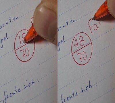 भाषा का गड़बड़ घोटाला: उत्तर पुस्तिका में बाकी के शब्द जर्मन भाषा में लिखे हैं, जबकि "Fail" अंग्रेजी में लिखा है। अगर ये जर्मनी का पेपर है, तो शिक्षक ने अंग्रेजी में क्यों लिखा?