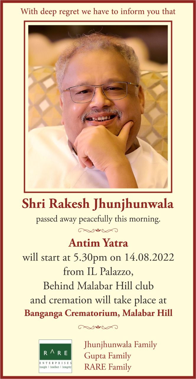 RIP Rakesh Jhunjhunwala Live Updates: राकेश झुनझुनवाला (Rakesh Jhunjhunwala) अब इस दुनिया में नहीं रहे। 62 साल की उम्र में उनका निधन हो गया है। ब्रिच कैंडी अस्पताल ने इस बात की जानकारी दी है। वह 62 साल के थे और किडनी की समस्या से जूझ रहे थे। सूत्रों के मुताबिक, उन्हें रविवार सुबह 6.45 पर मुंबई के कैंडी ब्रीच अस्पताल में भर्ती कराया था जहां उन्हें मृत घोषित कर दिया गया। राकेश झुनझु