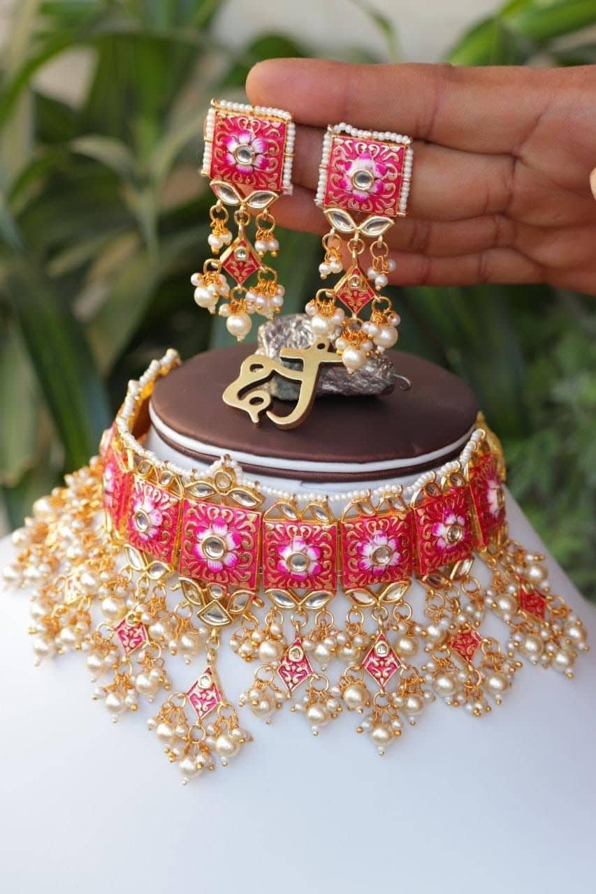 पिंक मीनाकारी हार ट्रेडिशनल और राजसी लुक देते हैं। इन्हें सोने या चांदी पर बारीकी से तैयार किया जाता है