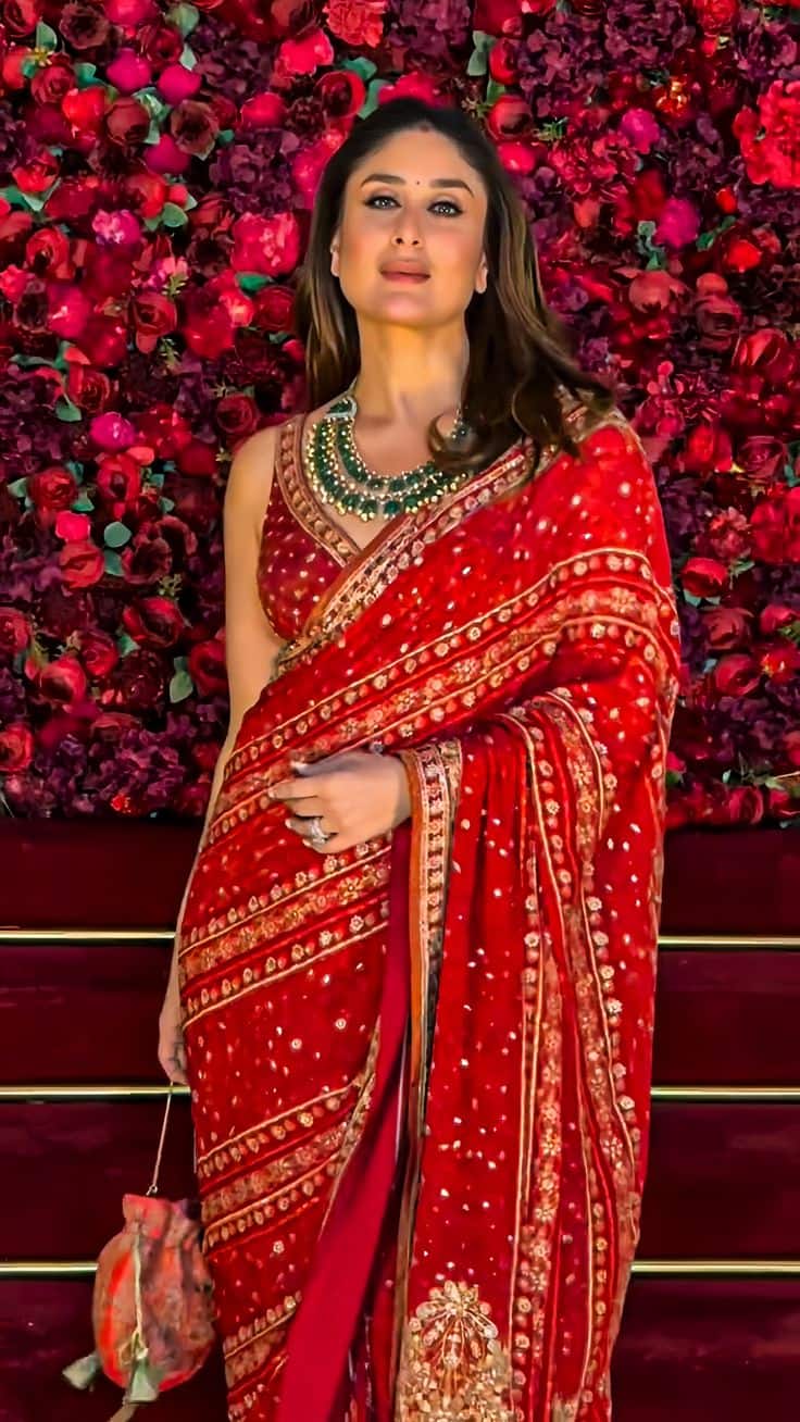 करीना अधिकतर फ्रैब्रिक पर ध्यान देती है, सिल्क, नेट, या शिफोन की साड़ी पहन सकती हैं