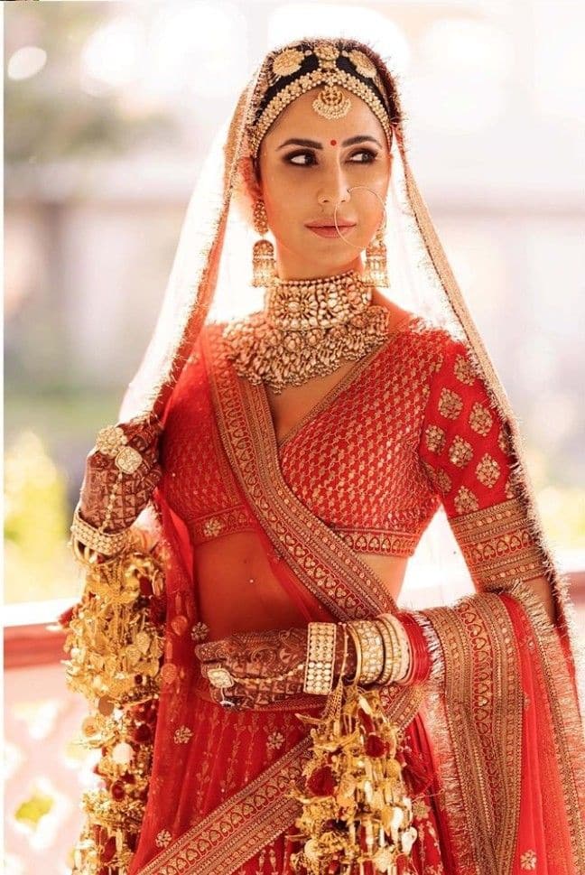 कैटरीना कैफ की शादी का लहंगा सब्यसाची से डिज़ाइन किया गया सिल्क लाल लहंगा था, जिसमें हाथ की एंब्रायडरी और ज़री का काम था