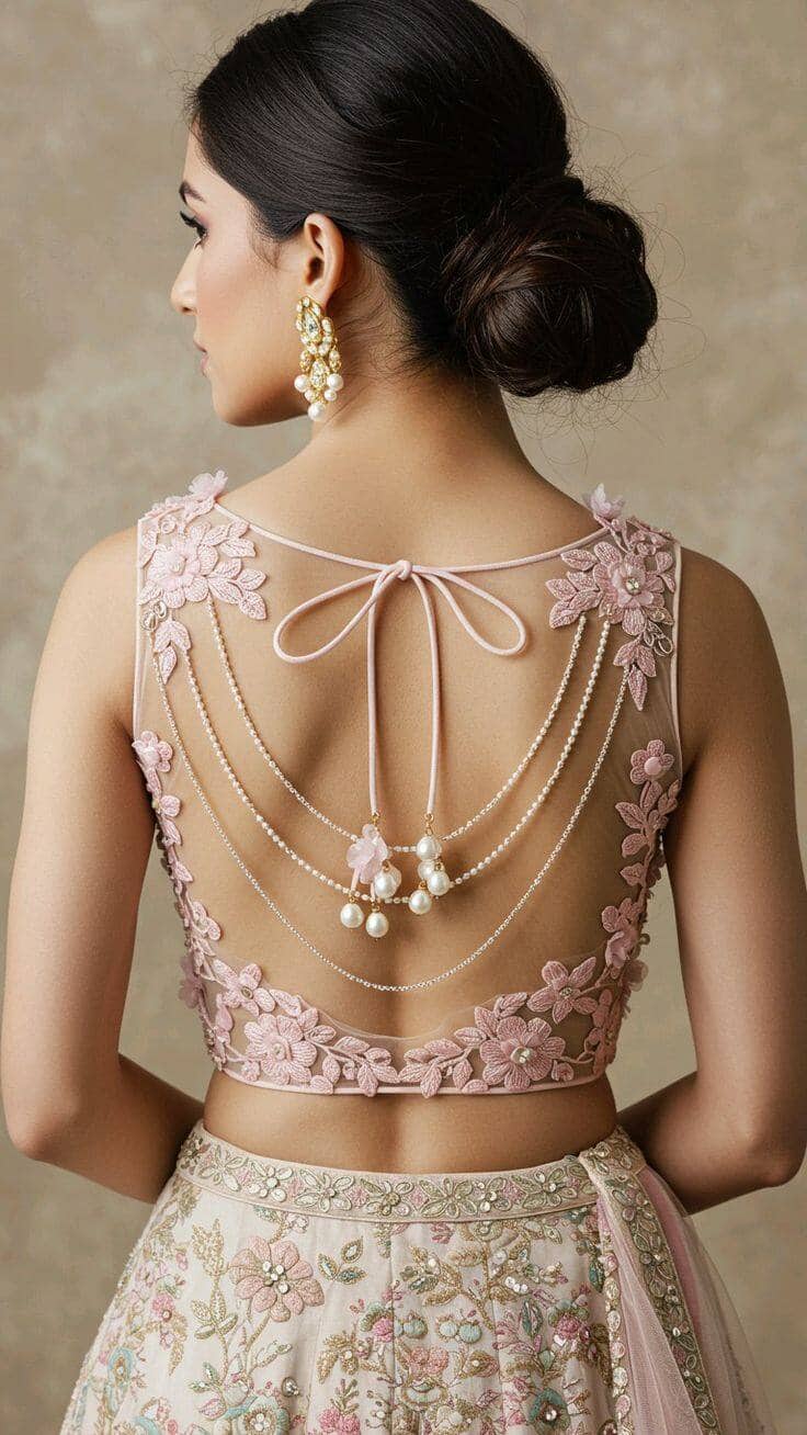 बैकलेस डिज़ाइन के स्ट्रैप्स पर लेस वर्क या कढ़ाई ब्लाउज को एक रिच और ट्रेडिशनल लुक दे सकती है