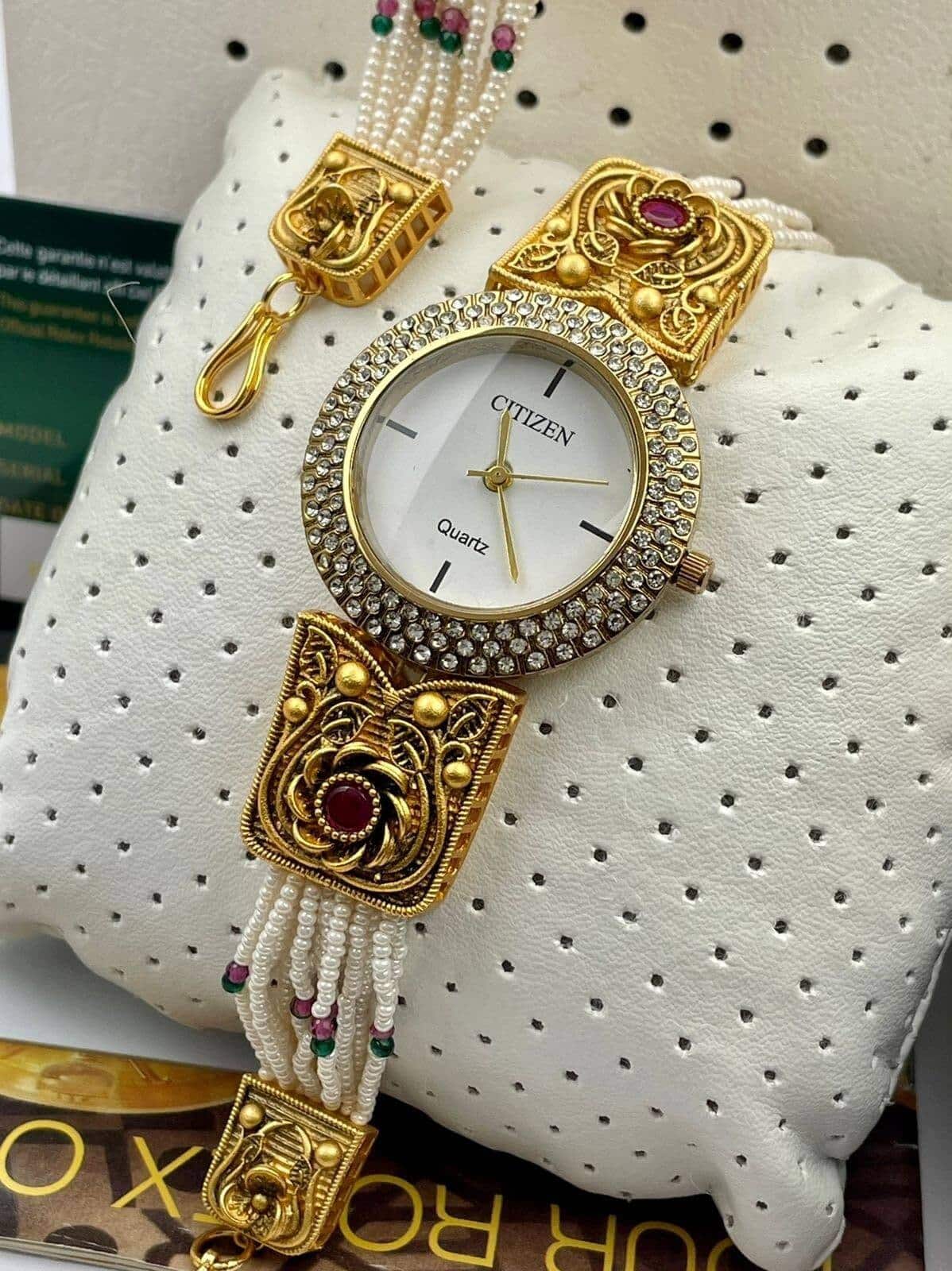 ट्रेडिशनल डिज़ाइन से इंस्पायर्ड ये घड़ियां कुंदन, क्रिस्टल और रूबी के साथ आती हैं, जो भारी और शानदार लगती हैं