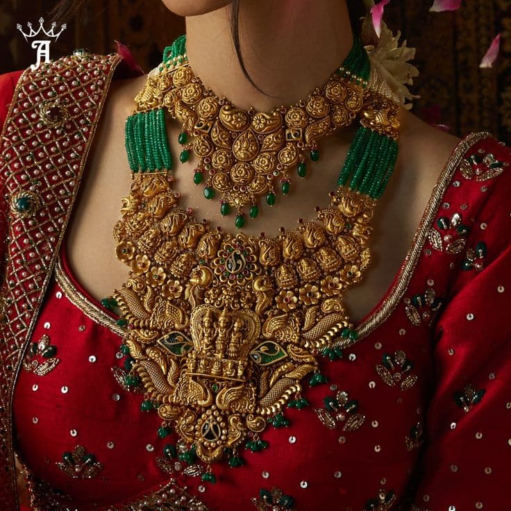 यह सेट साउथ इंडियन टेम्पल ज्वेलरी का एक खास डिजाइन है.