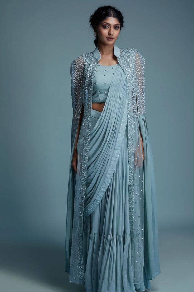 एक अट्रैक्टिव सिल्हूट बनाने के लिए आप साड़ी के ऊपर केप या पोंचो पहन सकती हैं