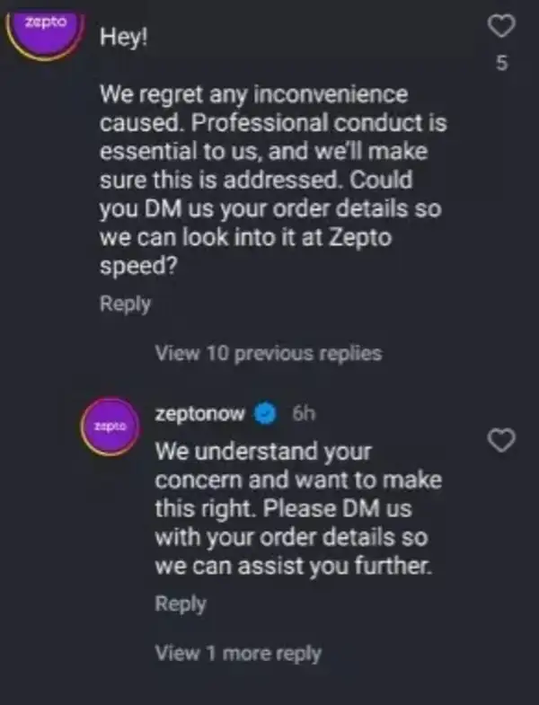 इसके तुरंत बाद, Zepto ने इस घटना पर खेद जताते हुए प्रतिक्रिया दी और पीड़ित की आगे भी मदद करने के लिए संभावित कार्रवाई का आश्वासन दिया। Zepto ने सोशल मीडिया प्लेटफॉर्म इंस्टाग्राम पर अपनी प्रतिक्रिया दी।